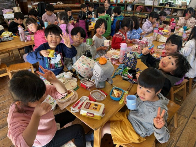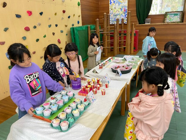 お店屋さんごっこでは年下のお友達に優しく声をかけ、店員さんになりきって自分達で作った物を売ることができました。野山遊びでは前回伐採した木の枝と毛糸等を使った制作や、マッチ付け体験、焚き火をしながら焼き芋も作りました。ふれあい体験では中学生に様々な遊びや絵本の読み聞かせをしていただきました。