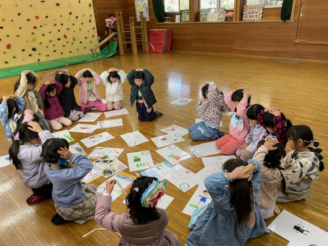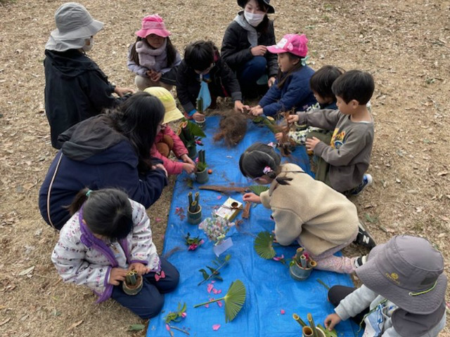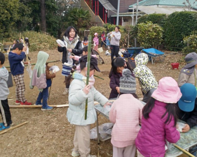 お店屋さんごっこでは年下のお友達に優しく声をかけ、店員さんになりきって自分達で作った物を売ることができました。野山遊びでは前回伐採した木の枝と毛糸等を使った制作や、マッチ付け体験、焚き火をしながら焼き芋も作りました。ふれあい体験では中学生に様々な遊びや絵本の読み聞かせをしていただきました。