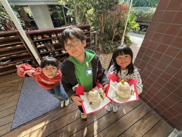 お餅つきがありました。前日からお餅つきをすることをとても楽しみにしていた子どもたち。園長先生の力を借りながら、重たい杵を使って1人3回お餅をつくことを楽しみ、鏡餅作りも行いました。また、出来立てのきなこ味と醤油味のお餅をいただくことができ「美味しい!」と、笑顔で味わう様子がありました。